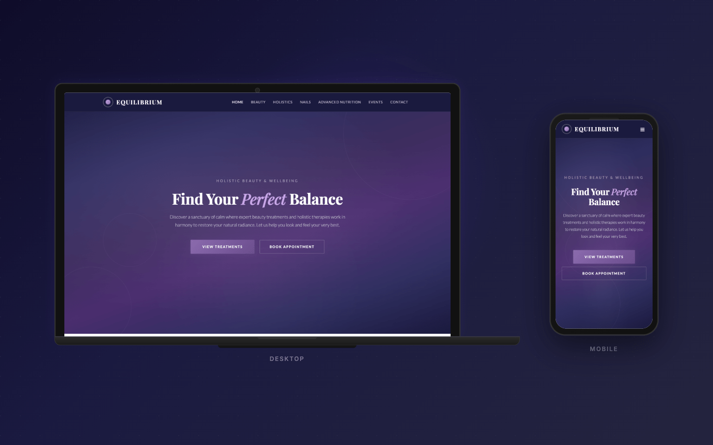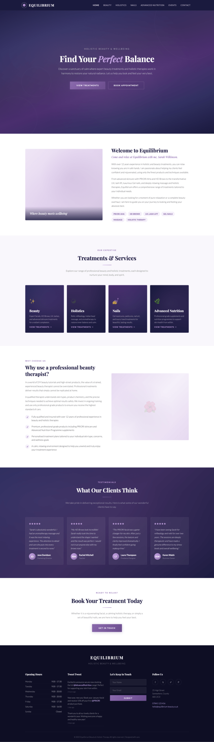 An elegant beauty therapy and wellness website with a sophisticated navy and purple color scheme. Features service listings, treatment details, pricing, and booking functionality with refined typography.